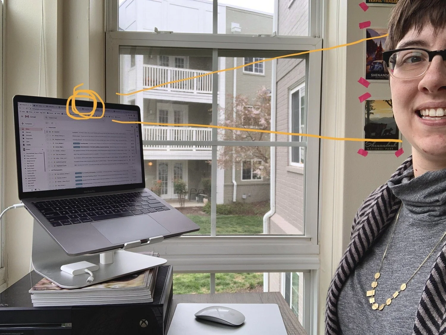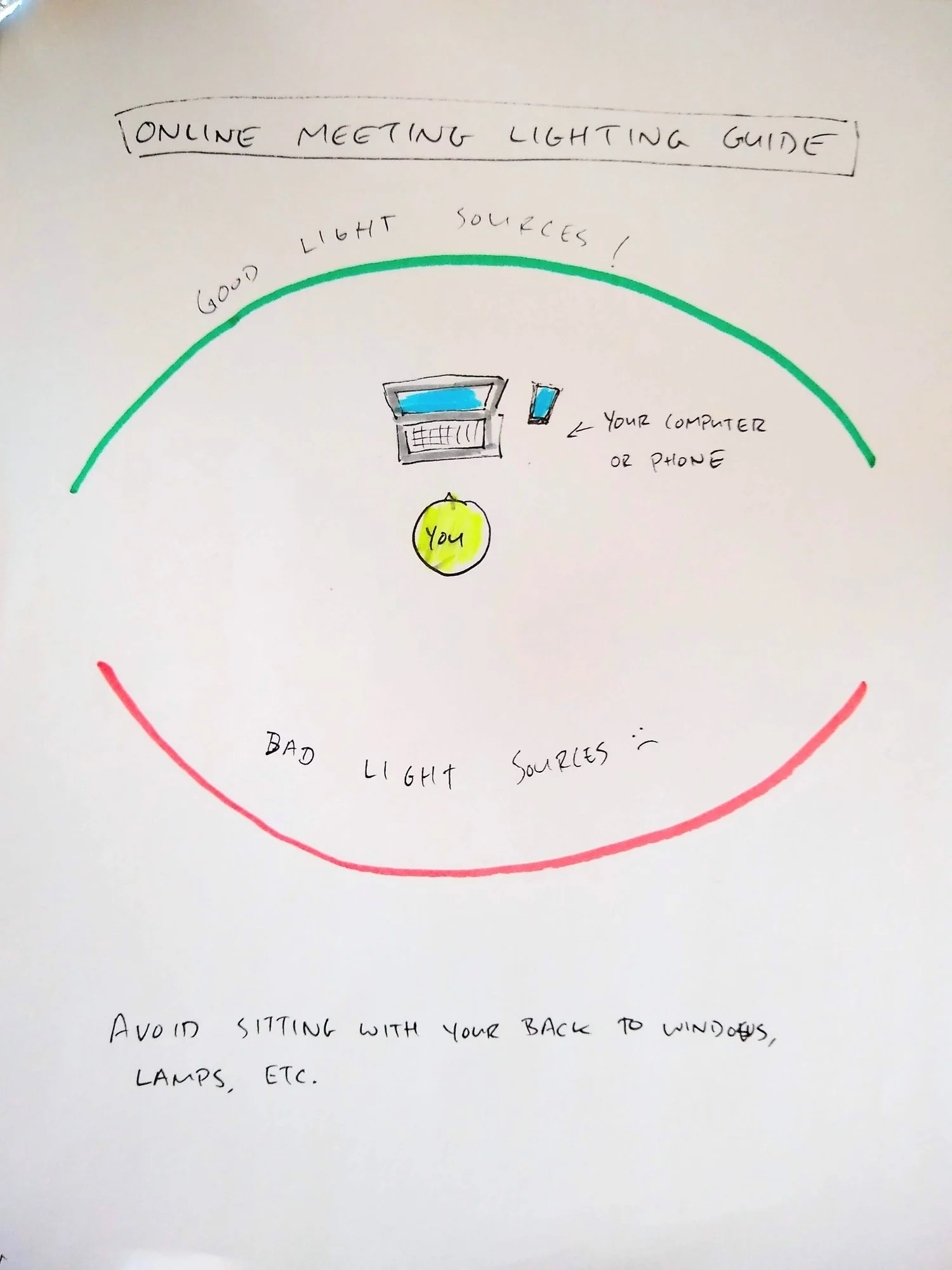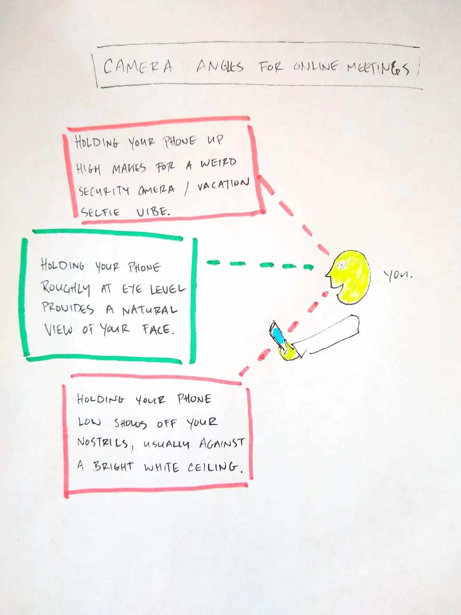 There are two things you can adjust wherever you are that have a big impact on how you look on videoconference: where you are in relation to your light source(s), and (phone or computer) camera angle. I was going to pull together a whole little tutorial, but my friend Colin, who also works in communications, shared an adorable hand-sketched this one on Twitter the other day: