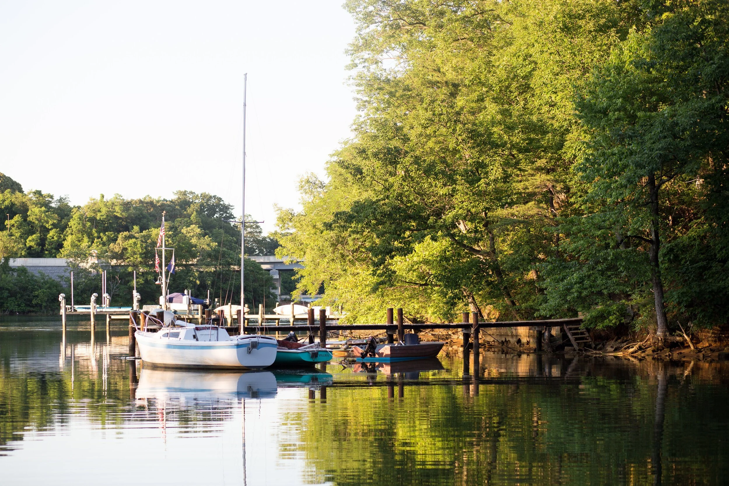 Docks from a private inlet of the Chesapeake Bay in Annapolis, Maryland (you can see the main road into downtown Annapolis in the background!)
